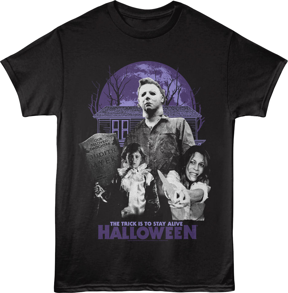 This Halloween t-shirt shows a full moon over the Myers house, Judith Myers' tombstone, Michael Myers as an adult, Michael Myers as a child, and Laurie Strode.