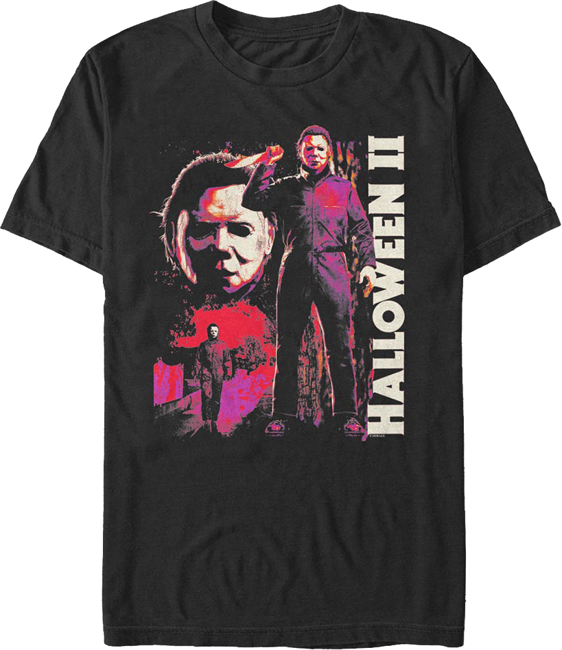 This Halloween II t-shirt features a collage of images of Michael Myers from the terrifying 1981 sequel.