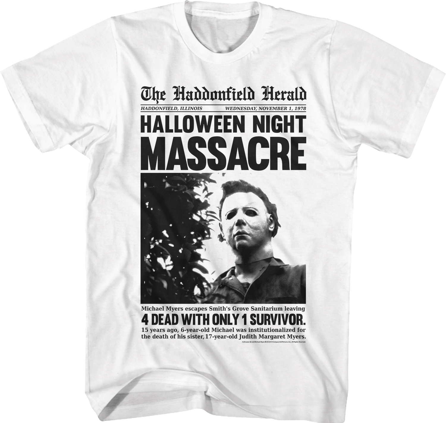 This Halloween t-shirt shows Michael Myers appearing in a headline for The Haddonfield Herald newspaper on November 1st, 1978. The headline explains that Myers escaped from Smith's Grove Sanitarium, and killed four people, while one survivor remained.