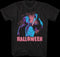 This Halloween t-shirt features an image of Michael Myers posing with his bloody butcher knife. The image is highlighted in neon colors.