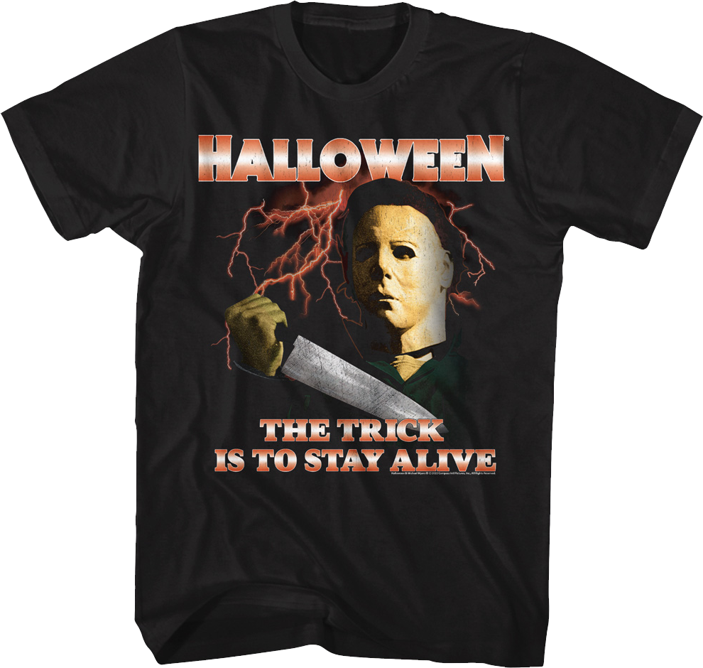 This Halloween t-shirt shows lightning bolts flashing as Michael Myers holds a butcher knife. The shirt includes the movie tagline, "The Trick Is To Stay Alive".
