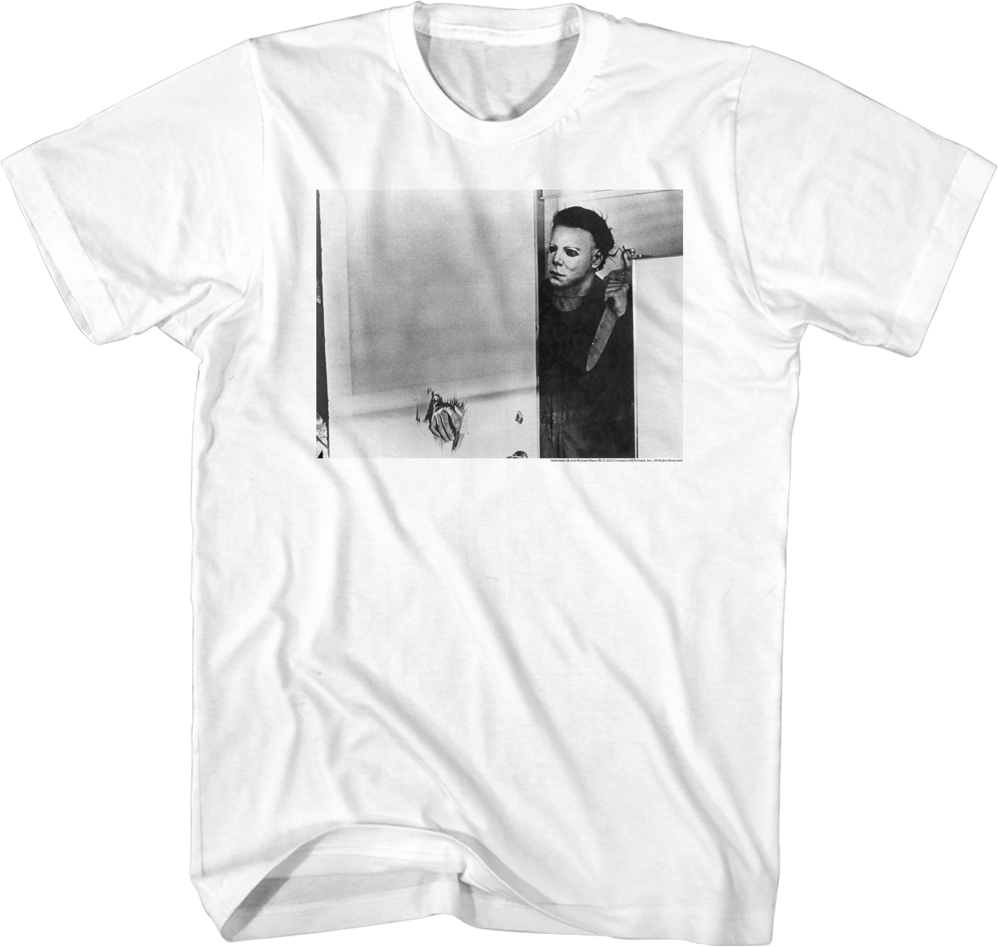 This Halloween t-shirt shows Michael Myers punching through a door to unlock it so he could continue his chase of Laurie Strode.