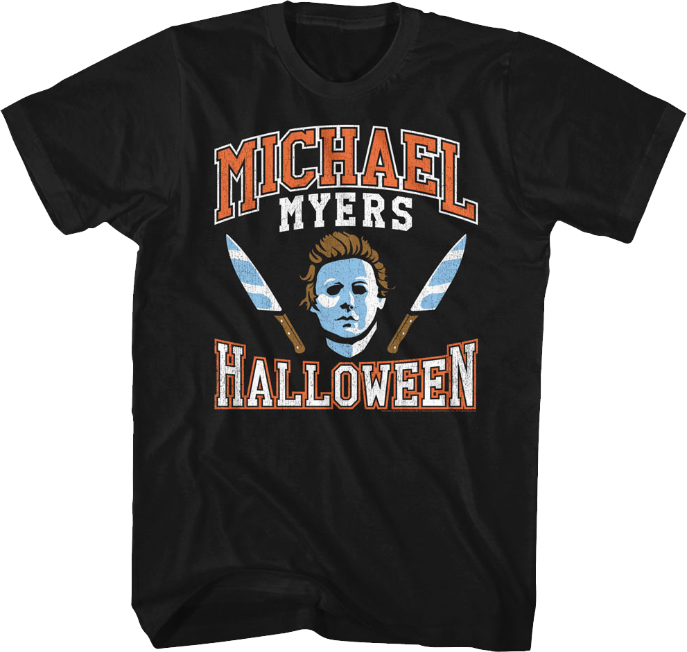 Michael Myers Mask And Knives Varsity Logo Halloween T-Shirt