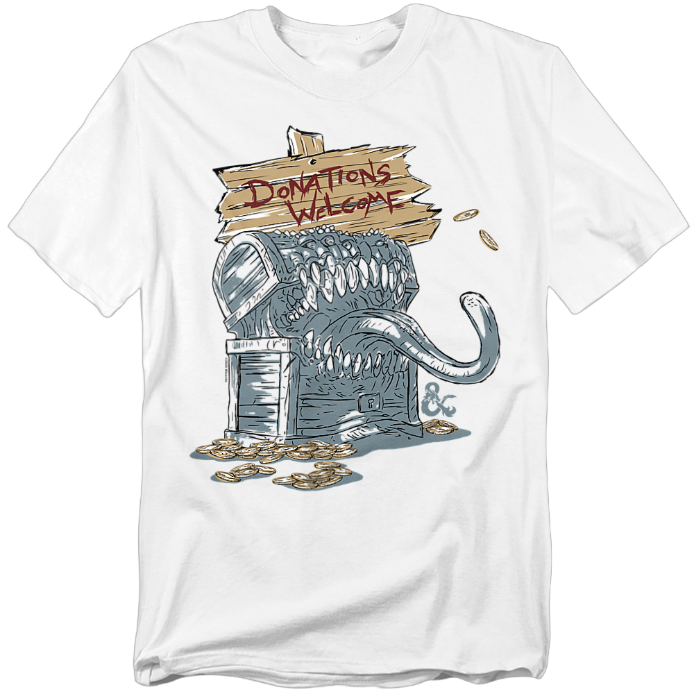 This Dungeons & Dragons t-shirt features an image of the shapechanger Mimic disguised as a man-eating treasure chest. Mimic is seen with a sign that reads Donations Welcome.