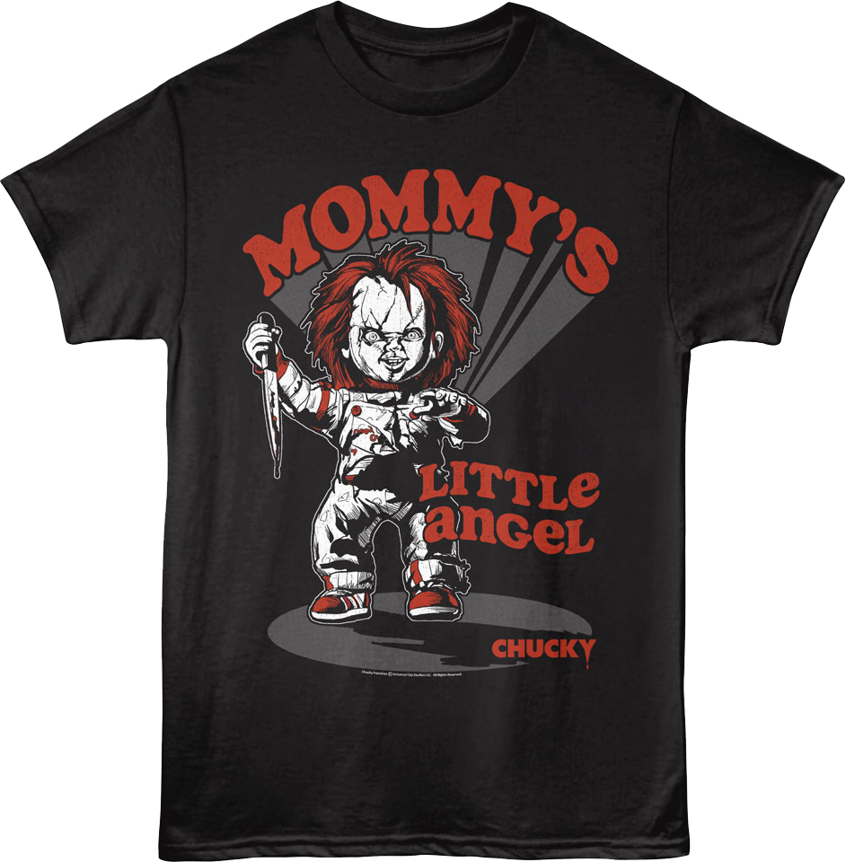 In Child's Play, Karen Barclay gave her son, Andy a Good Guy doll named Chucky for his birthday. Little did Karen know, the doll was possessed by the spirit of the serial killer Charles Lee Ray. Chucky soon showed that he could be a true menace when he went on a killing rampage and proved to be one of the greatest icons in the history of slasher films. Everyone will instantly know you are a fan when you wear this Mommy's Little Angel Child's Play T-Shirt!