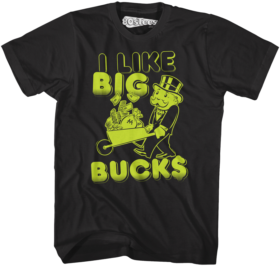 This Monopoly shirt features Mr. Monopoly pushing a wheelbarrow full of cash. If Sir Mix-A-Lot wrote a song for Mr. Monopoly, it would start out with, "I Like Big Bucks".