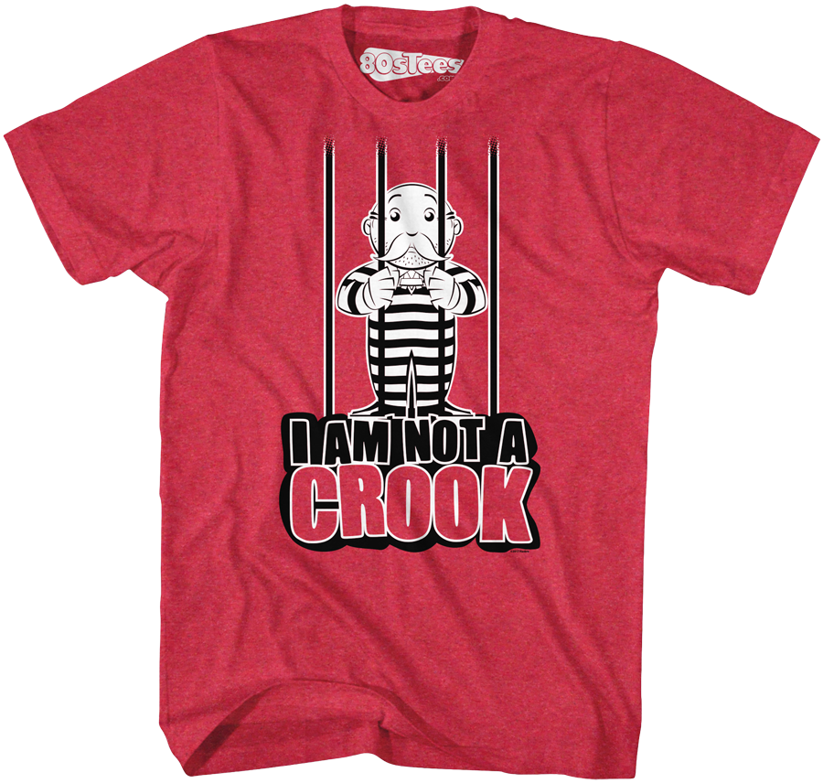 This Monopoly shirt features Mr. Monopoly behind bars in his prison stripes with the phrase "I Am Not A Crook".