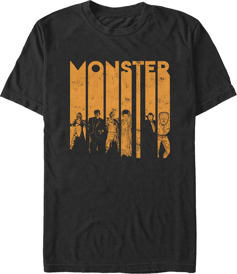 The monsters on this t-shirt represent the Golden Age of horror movies, starting with Dracula in 1931, Frankenstein in 1931, The Mummy in 1932, The Invisible Man in 1933, The Bride Of Frankenstein in 1935, The Wolf Man in 1941, and The Creature From The Black Lagoon in 1954.