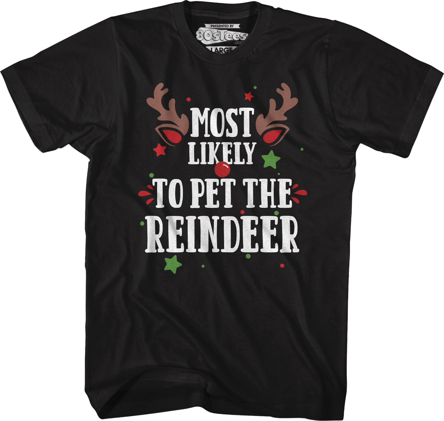 On Christmas Eve, Santa Claus travels the world, delivering presents in a sleigh that is pulled by magic reindeer. While Santa is inside people's homes, leaving their gifts and stocking stuffers, some people are brave enough to sneak outside and pet Santa's reindeer. Everyone will know you are a fan of Rudolph, Dasher, Dancer, Prancer, Vixen, Comet, Cupid, Donner, and Blitzen when you wear this 80sTees.com exclusive Most Likely To Pet The Reindeer T-Shirt!
