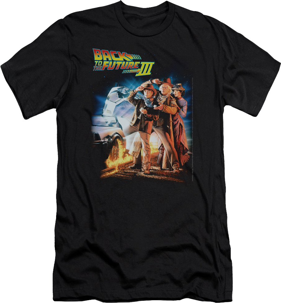 This Back To The Future Part III t-shirt features the movie's poster artwork with Marty McFly, Doc Brown, and Clara Clayton next to the time traveling DeLorean.