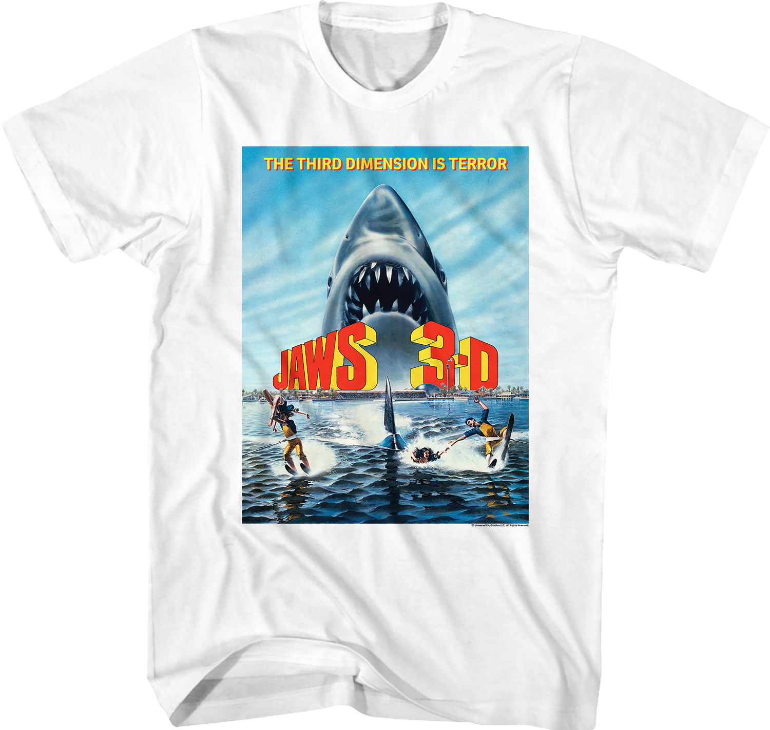 Jaws is one of the most frightening franchises of all time, and Jaws 3-D is a true cult classic. Everyone will know you are a fan when you wear this Movie Poster Jaws 3-D T-Shirt!