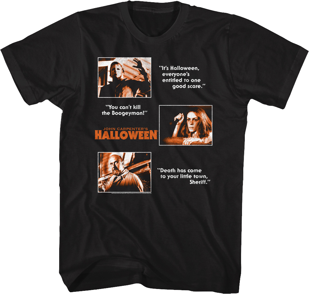 This Halloween t-shirt features images of Michael Myers, Laurie Strode, and Dr. Samuel Loomis. The shirt includes the iconic quotes "It's Halloween, everyone's entitled to one good scare", "You can't kill the boogeyman!", and "Death has come to your little town, Sheriff."