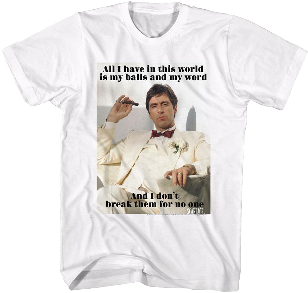 This Scarface t-shirt features an image of Tony Montana. The reads All I have in this world is my balls and my word. And I don't break them for no one.
