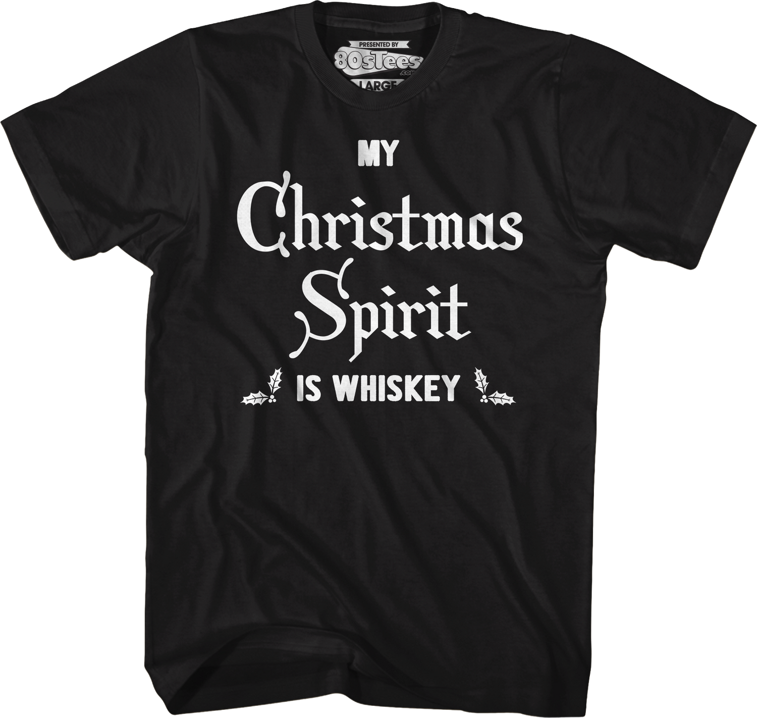 Let everyone know you've found a cure for your end-of-the-year fatigue with this 80sTees.com exclusive My Christmas Spirit Is Whiskey T-Shirt!