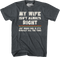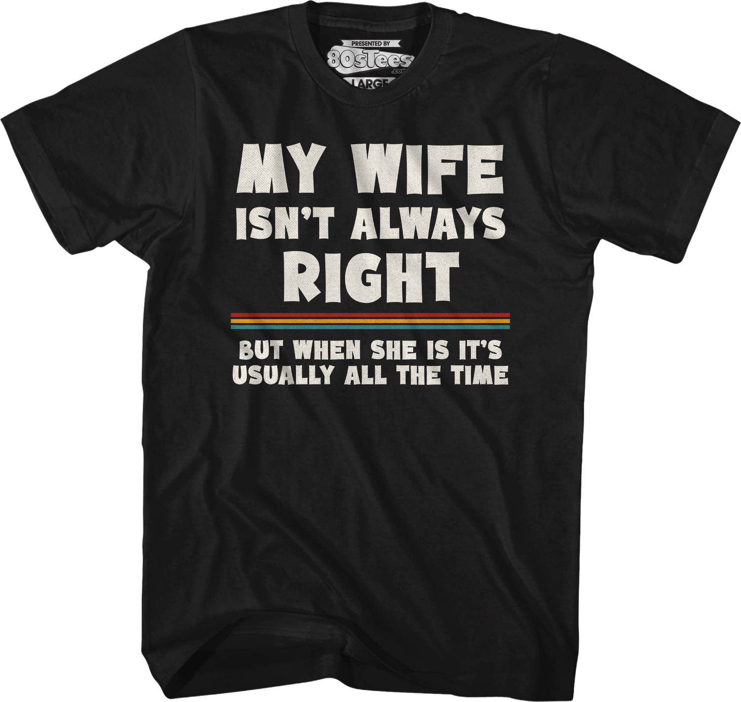 This 80sTees.com exclusive t-shirt features retro stripes and distressed letters that read My Wife Isn't Always Right But When She Is It's Usually All The Time.