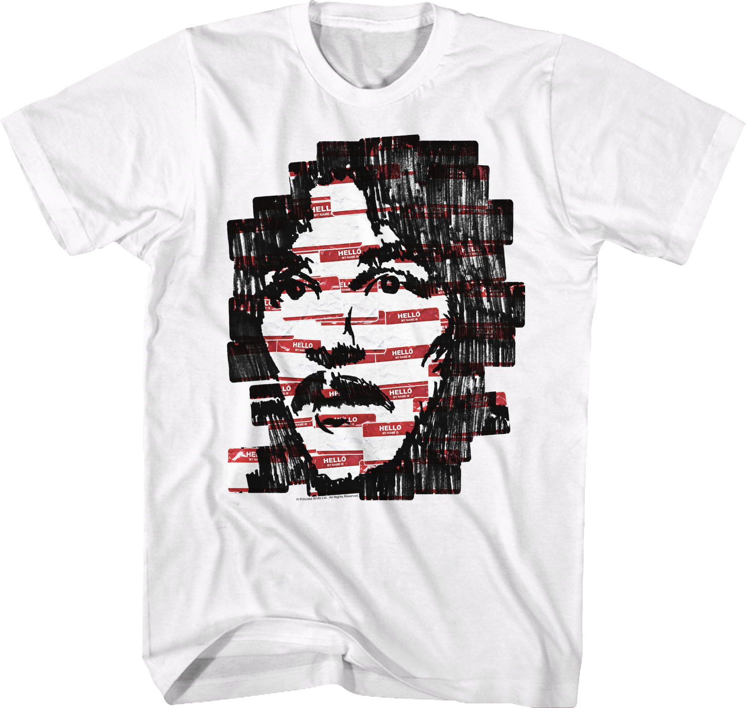 In The Princess Bride, Inigo Montoya's popular catchphrase was "Hello. My name is Inigo Montoya. You killed my father. Prepare to die". The Spanish swordsman could have eliminated part of that quote by wearing a name tag. This Princess Bride t-shirt shows a collection of name tags that have been scribbled on to make a sketch of Inigo Montoya!