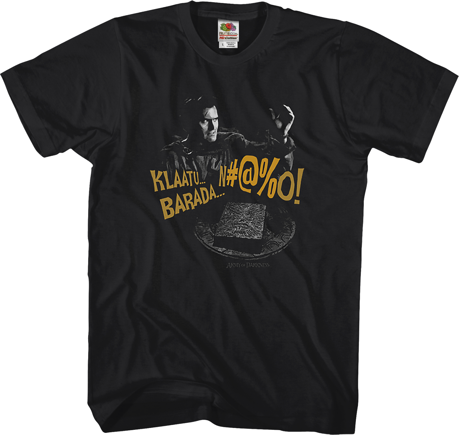In Army of Darkness, Ash was transported to AD 1300. The only way to return to his own time was for Ash to find the Necronomicon and recite the words "Klaatu Varata Nicto". As this shirt shows, Ash could not remember the phrase, and he unleashed demons instead.
