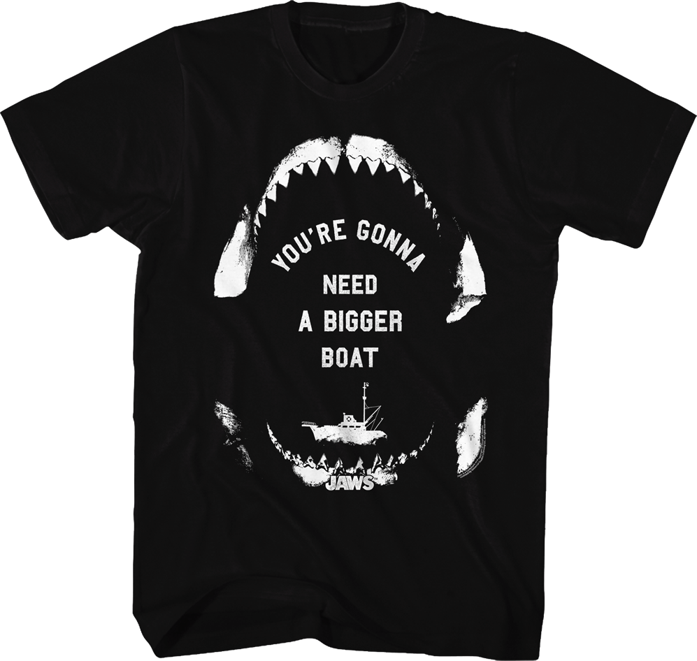 Besides showing one of the most frightening predators of all time, the 1975 classic Jaws is also memorable for its iconic quotes. One of those quotes came from Chief Brody, when he told Quint, "You Are Going To Need A Bigger Boat". That quote appears on this shirt inside of a bite radius that matches the victims of Amity Island. For any fan of Jaws, this Need A Bigger Boat t-shirt is a must have.