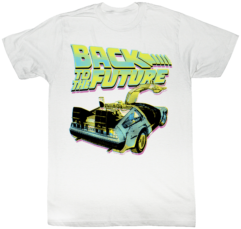 This Back To The Future t-shirt shows the movie logo and Doc Brown's DeLorean in neon colors.