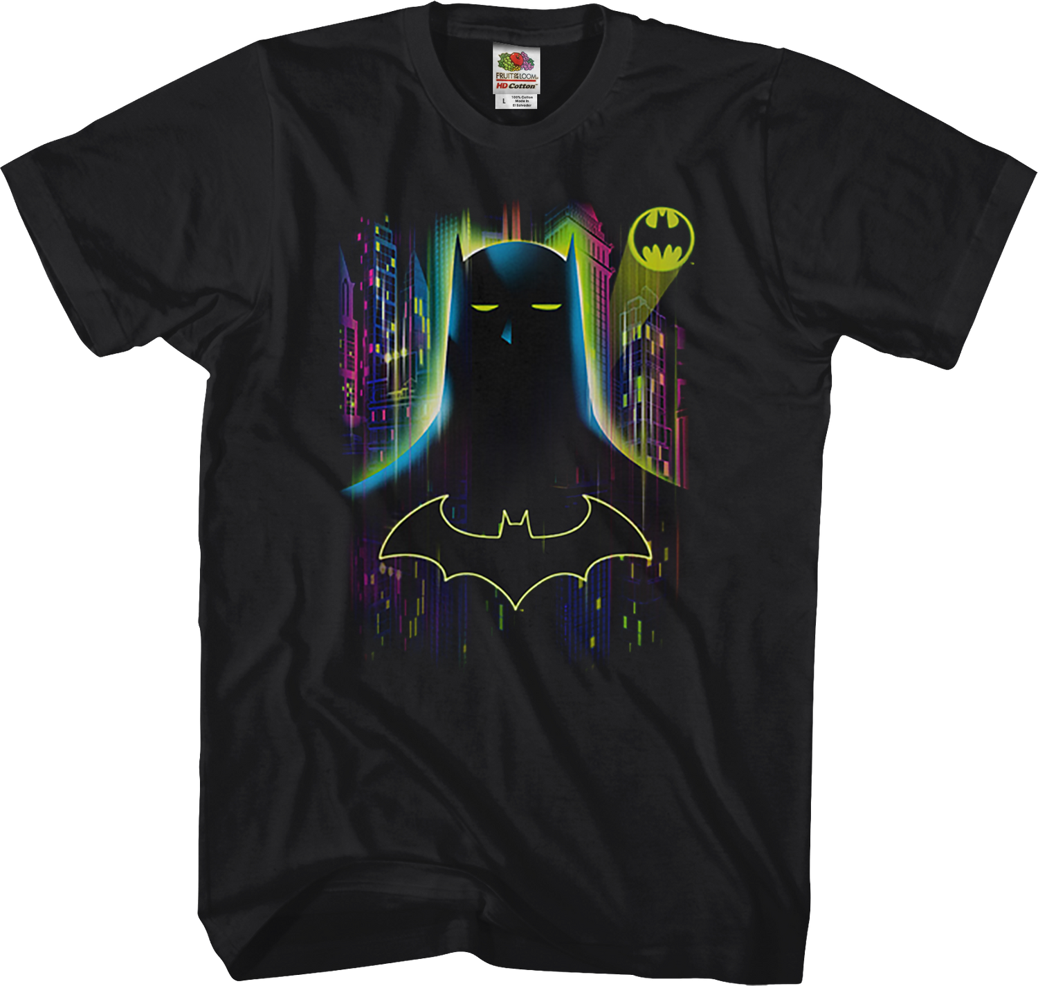This Batman t-shirt features an image of the Caped Crusader in Gotham City as the Bat Symbol shines overhead. Gotham City is lit up with neon lights, creating a glow around Batman.