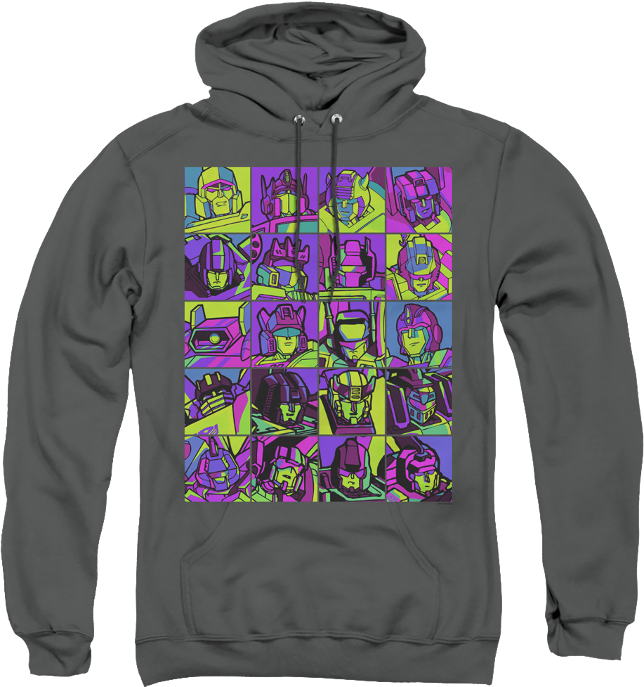 For any fan of the robots in disguise, this Neon Pop Art Robot Collage Transformers Hoodie is a must have!