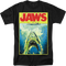 This Jaws t-shirt features the iconic poster for the 1975 classic, which shows a great white shark ready to attack a swimmer. The poster is highlighted in neon colors.