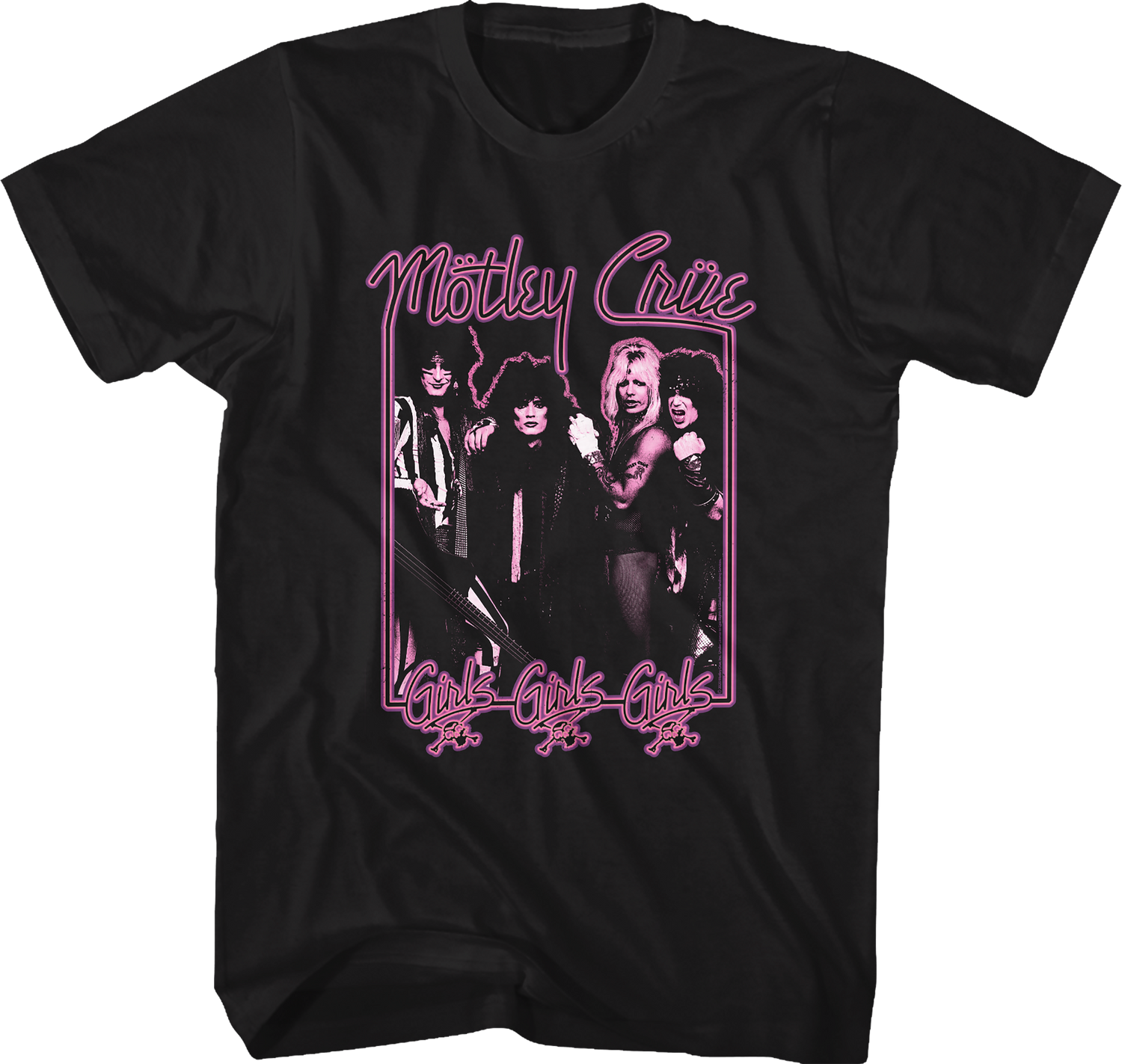 This Motley Crue t-shirt features an image of band members Tommy Lee, Nikki Sixx, Vince Neil, and Mick Mars. The shirt includes the title of the Motley Crue's hit album Girls, Girls, Girls.