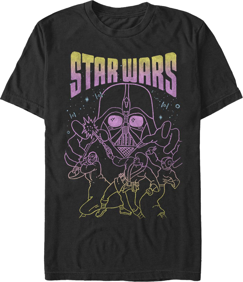 In Star Wars Episode IV, Luke Skywalker is thrust into the struggle of the Rebel Alliance when he meets Obi-Wan Kenobi, who has lived for years in seclusion on the desert planet of Tatooine. Obi-Wan begins Luke’s Jedi training as Luke joins him on a daring mission to rescue the beautiful Rebel leader Princess Leia from the clutches of Darth Vader and the evil Empire. Everyone will know you are a fan of George Lucas' 1977 classic when you wear this Neon Sketch Star Wars T-Shirt!