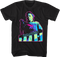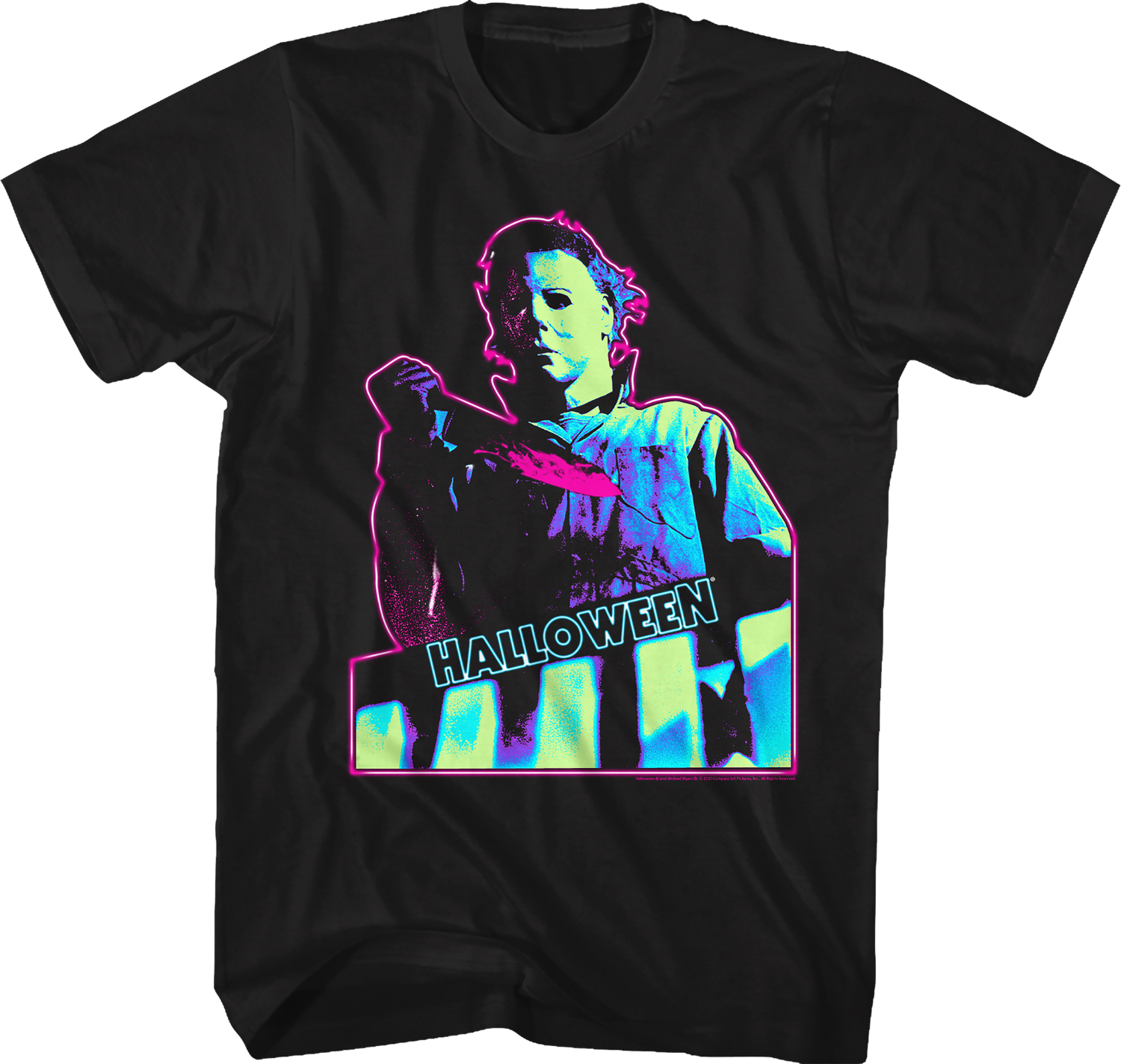 This Halloween t-shirt features the terrifying image of Michael Myers holding a bloody knife and looking over a banister after stabbing Laurie Strode in John Carpenter's classic horror movie. Michael is highlighted with bright neon colors.