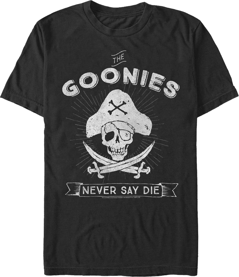 For any fan of the hilarious 1985 classic, this Never Say Die Pirate Logo Goonies T-Shirt is a must have!