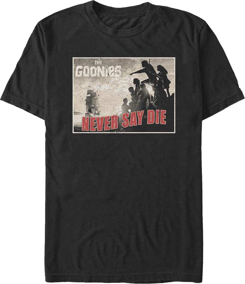 Everyone will instantly know you are a fan of the 1985 classic when you wear this Never Say Die Postcard Goonies T-Shirt!