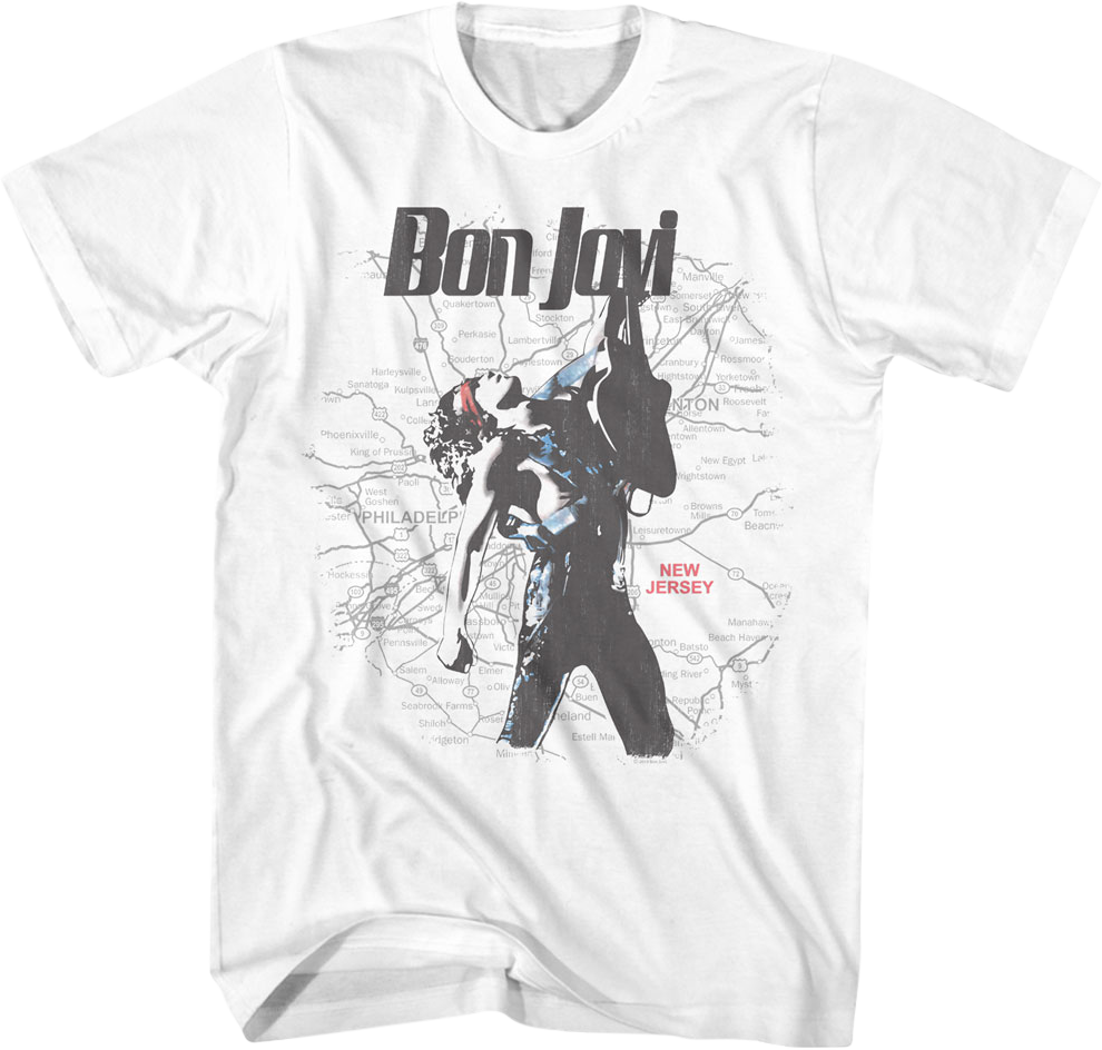 Everyone will immediately know that you are a fan of Bon Jovi when you wear this New Jersey Map Bon Jovi t-shirt!