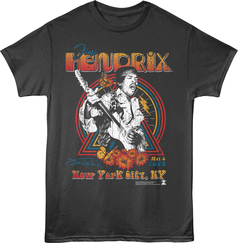 This Jimi Hendrix t-shirt shows the legendary musician performing live in New York City, butterflies, flowers, a lightning bolt, retro colors in a triangle and circle, and Jimi Hendrix's autograph.