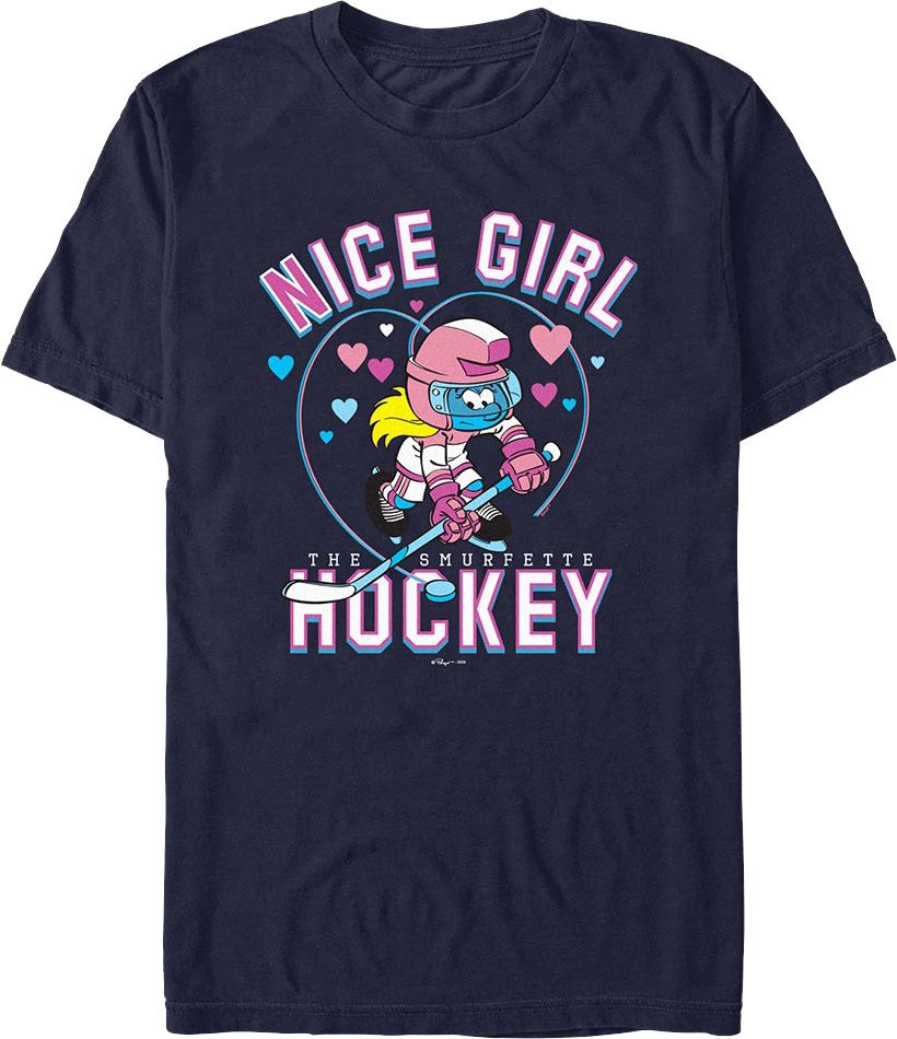 This Smurfs t-shirt shows Smurfette playing ice hockey. The shirt reads Nice Girl Hockey.