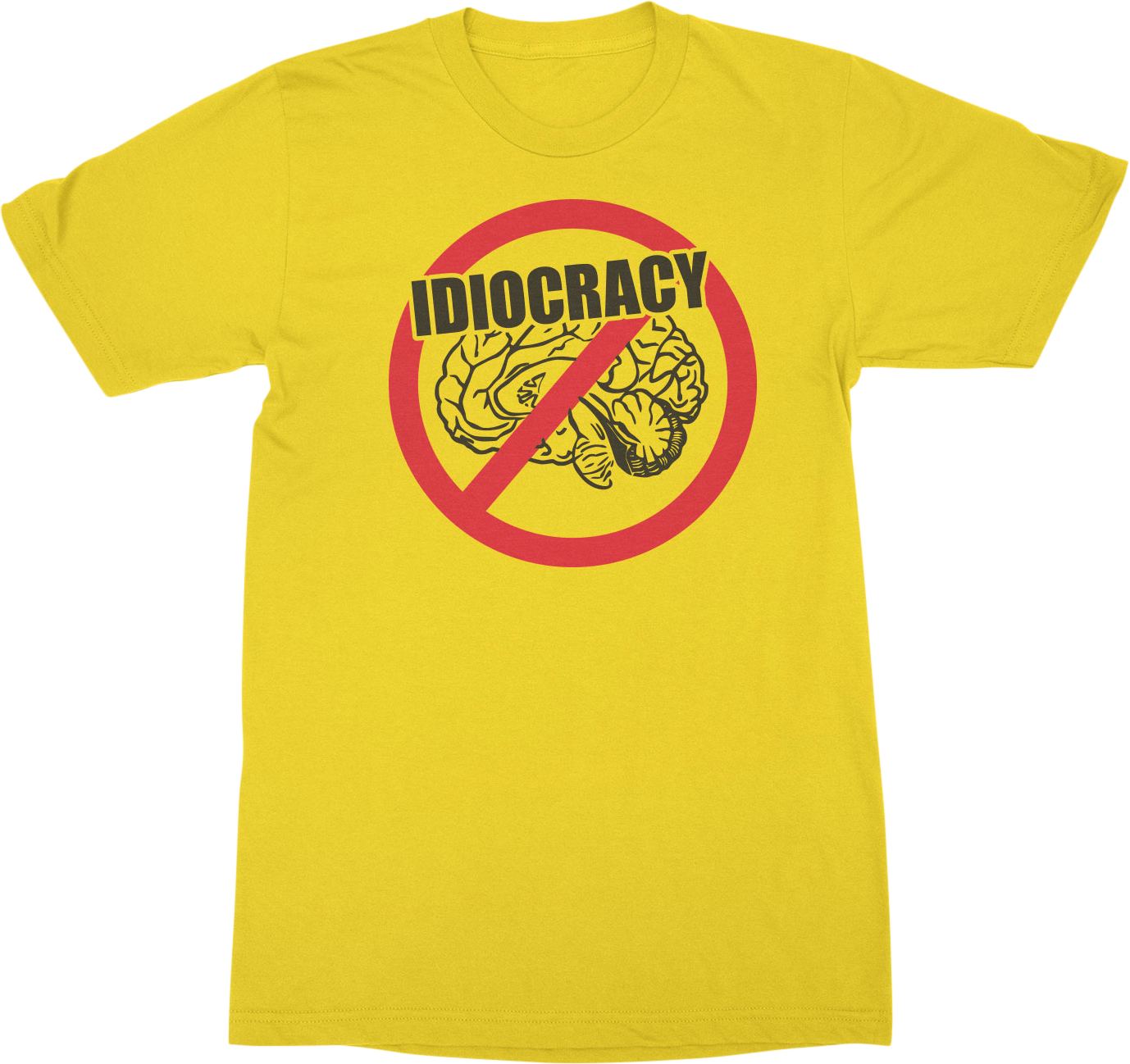 This Idiocracy t-shirt shows a no brain logo. Most science fiction predicted a future that was more civilized and more intelligent, but by the year 2505 a dumbing down had occurred because evolution does not always reward intelligence. The movie Idiocracy shows Earth populated by idiots who need a man like Joe Bauers from the year 2005 to save the world. Let everyone know that you are a fan of Mike Judge's cult classic with this No Brain Logo Idiocracy t-shirt!