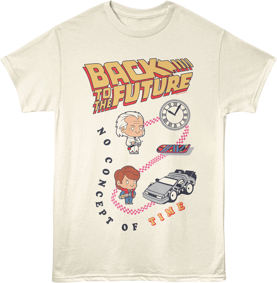 This Back To The Future t-shirt features chibi versions of Doc Brown and Marty McFly. The shirt also shows the clock from the Hill Valley clock tower, a Hoverboard, and Doc's DeLorean. The shirt reads No Concept Of Time.