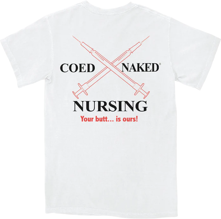 Coed Naked became part of the culture in America in the 1990’s donning classic catchphrases, like the one that appears on this nursing shirt, "Your butt...is ours!" Coed Naked shirts have dominated the beaches from Maine to Florida, all college campuses from UNH to Ohio State, to USC, and malls throughout the country. Everyone will immediately know you are a fan when you wear this Nursing Coed Naked T-Shirt!