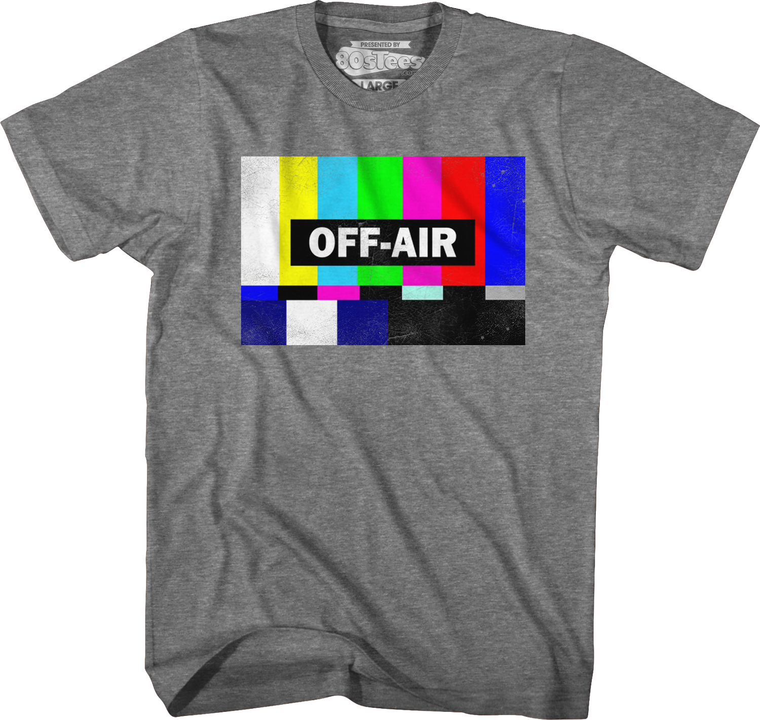 This 80sTees.com exclusive t-shirt features the colorful television test pattern. The shirt reads Off-Air.
