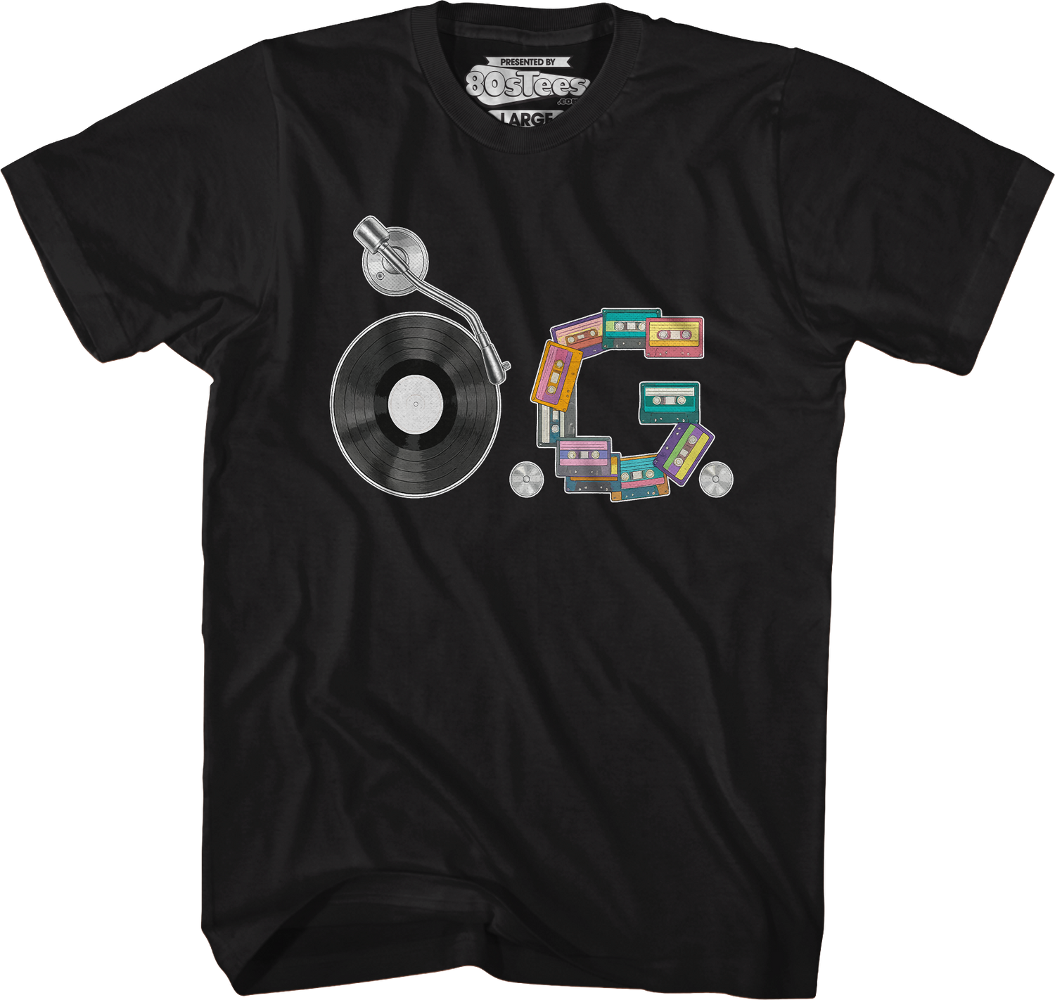 This 80sTees.com exclusive t-shirt shows the round shape of a record player, compact discs as periods, and cassette tapes positioned to make the letter G. Put together, these images spell "O.G."