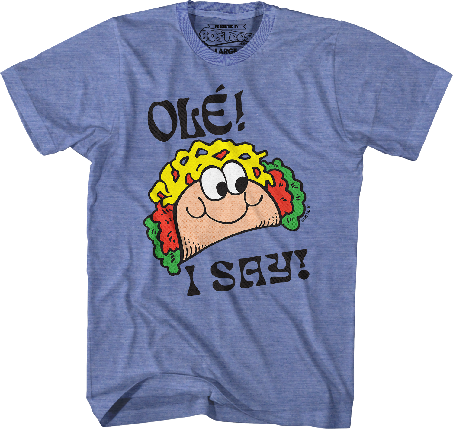 This 80sTees.com exclusive TREND Scratch ‘n Sniff Stinky Stickers® t-shirt features the smiling taco from the TREND Olé Taco Scratch ‘n Sniff Stinky Stickers® design. The shirt reads OLÉ! I SAY!