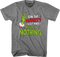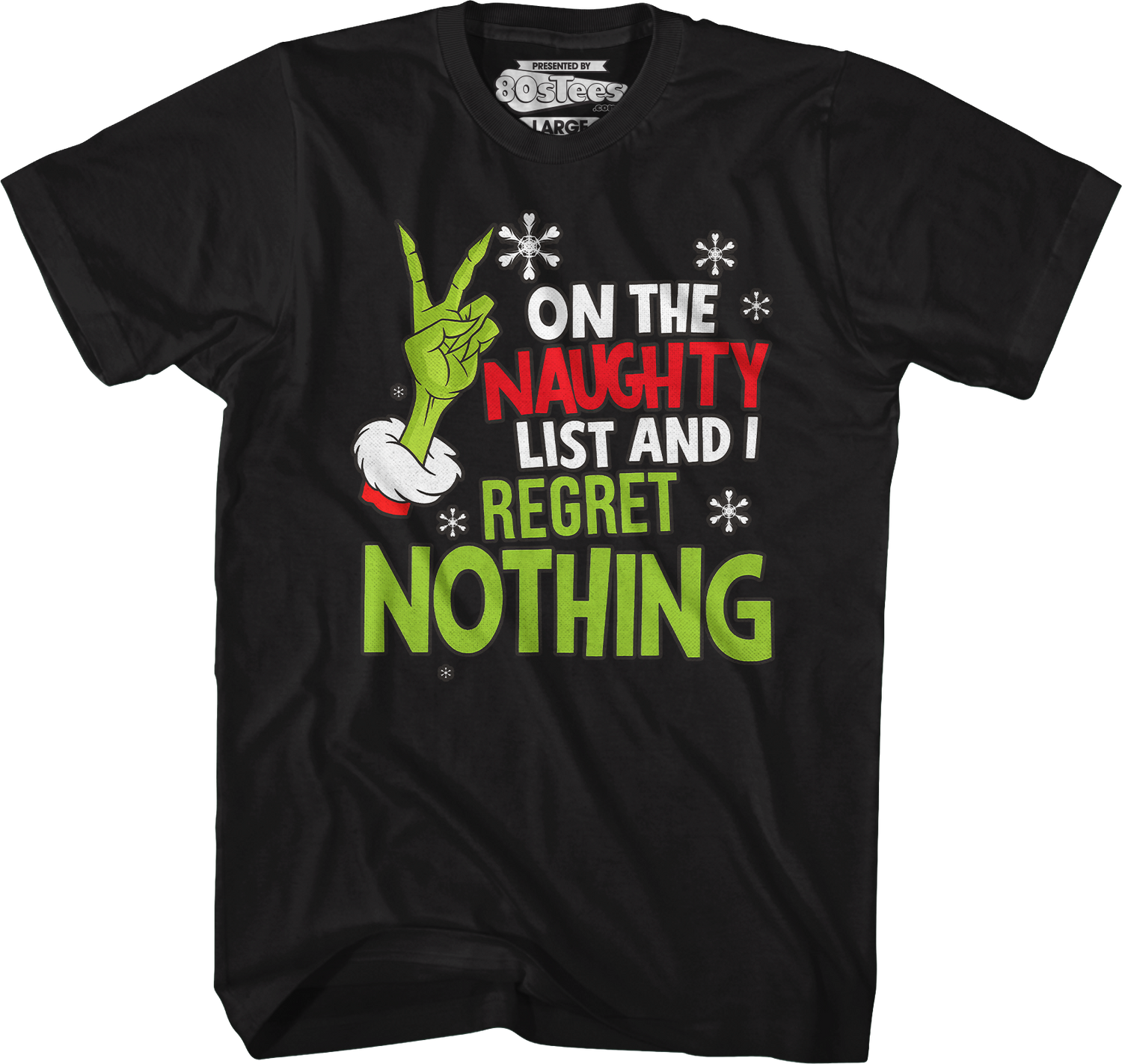 This 80sTees.com exclusive t-shirt shows the Grinch's hand surrounded by snowflakes. The shirt reads On The Naughty List And I Regret Nothing.