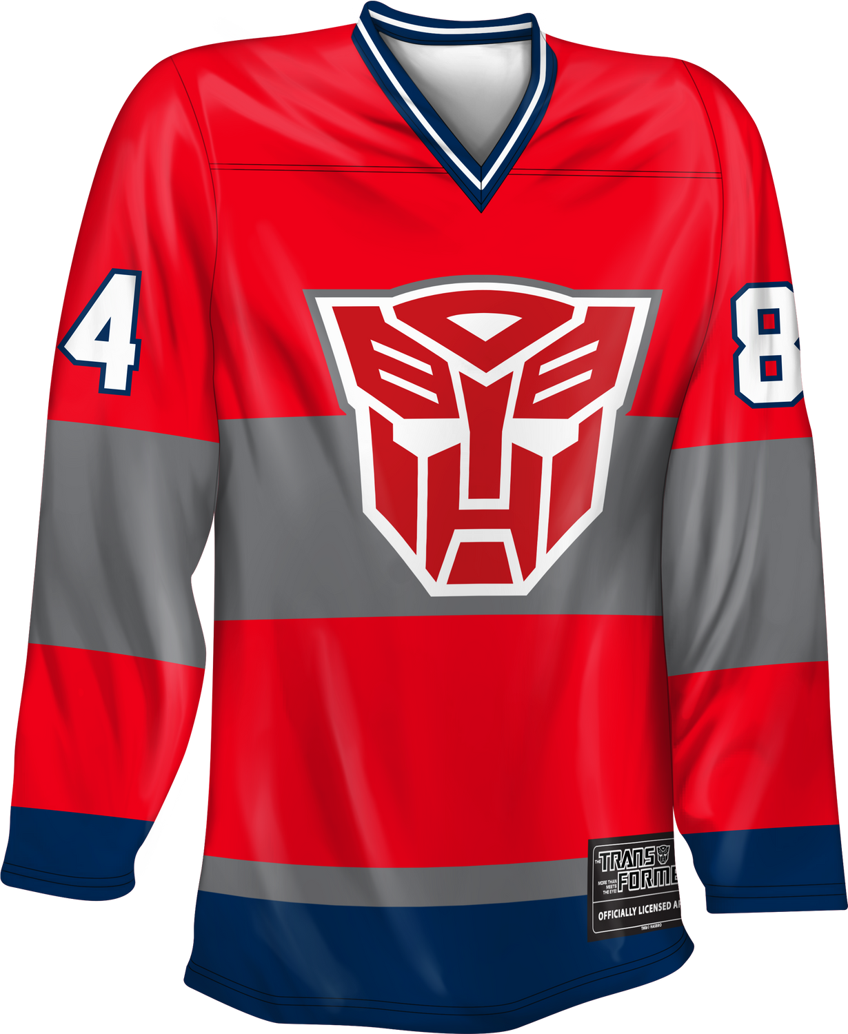 The Autobots have battled the Decepticons on a television series and on the big screen. One place the Transformers have never battled is on a hockey rink. Now, you can join the Autobots team for the ultimate hockey fight with this 80sTees.com exclusive Optimus Prime hockey jersey!