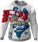 This 80sTees.com exclusive Transformers zippered hoodie features an image of the leader of the Autobots, Optimus Prime. Prime covers the front and right sleeve of the hoodie, and the image ends on the back of the hoodie. The back also includes the iconic Transformers logo.