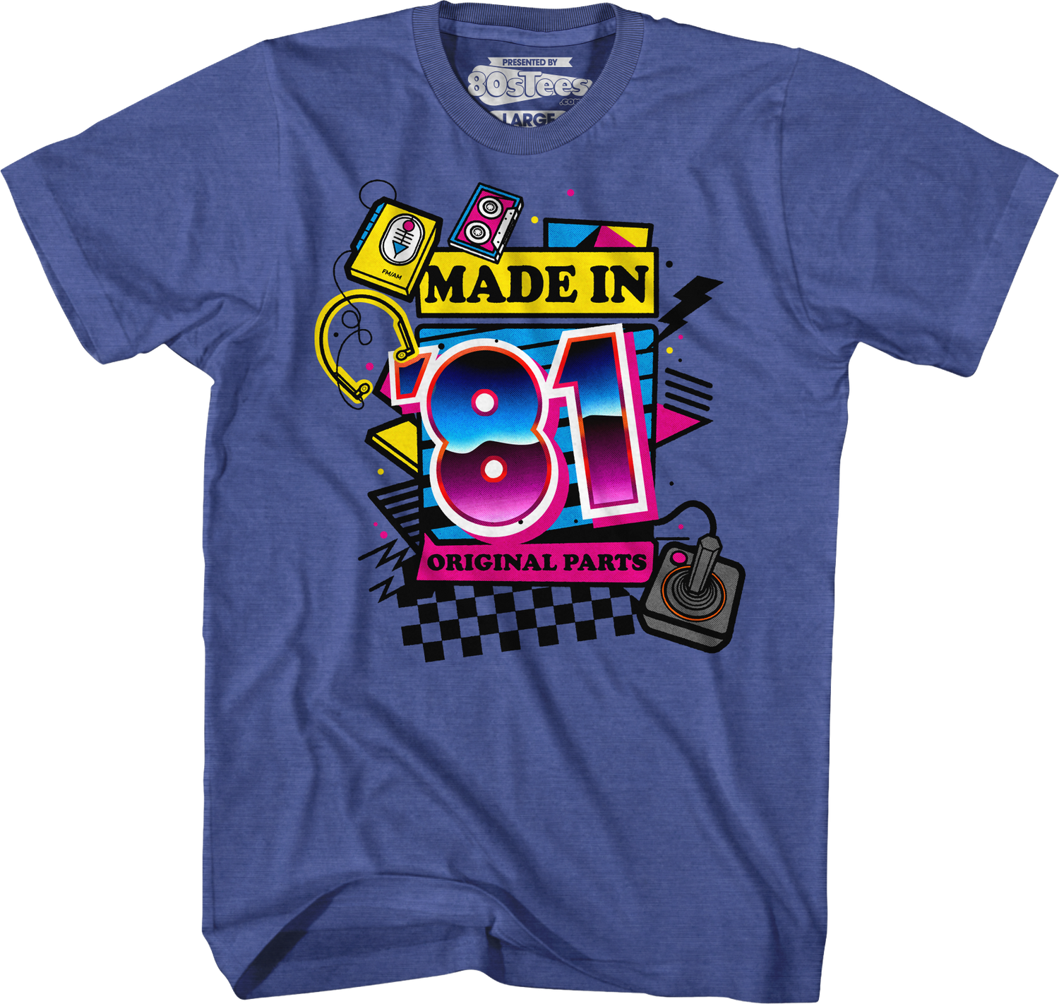 This 80sTees.com exclusive t-shirt features a retro design that includes a Walkman, a cassette tape, and a joystick. The shirt reads "Made In '81. Original Parts." The top selling cassettes of 1981 include Face Value by Phil Collins, Business As Usual by Men At Work, and Ghost In The Machine by The Police. The top selling home video games of 1981 include Warlords, Night Driver, and Asteroids.