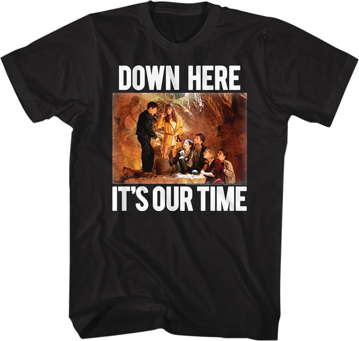 This Goonies t-shirt shows Mikey, Andy, Data, Brand, Stef and Mouth. The shirt reads Down Here It's Our Time.