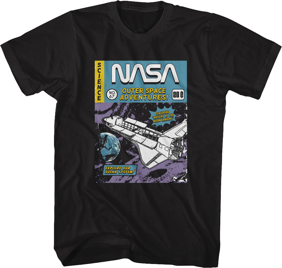 For any fan of the agency responsible for conducting research in various fields related to aerospace exploration, this Outer Space Adventures Comic Book Cover NASA T-Shirt is a must have!