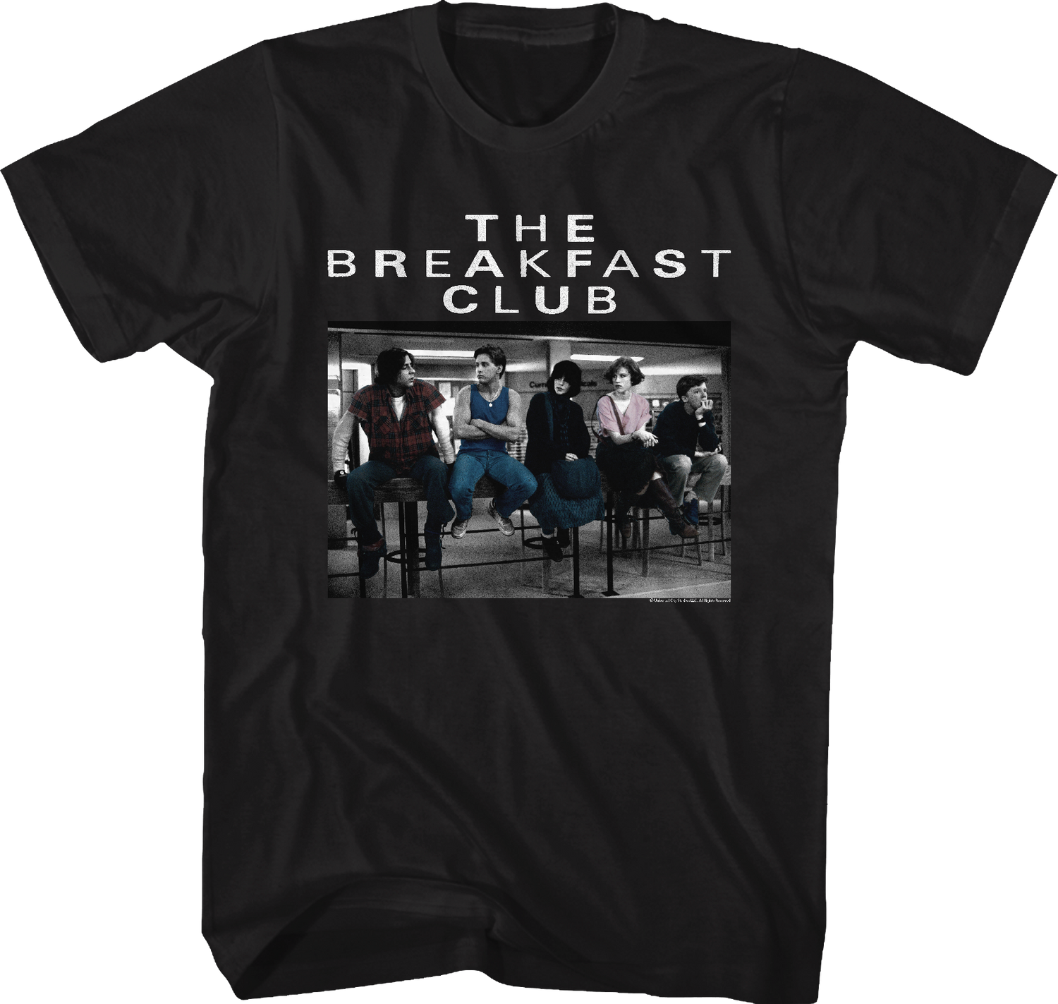 All of the members of morning detention at Shermer High are shown on this Painted Breakfast Club T-Shirt. John Bender, Andrew Clark, Allison Reynolds, Claire Standish, and Brian Johnson are pictured sitting in a line in the library. Their clothes are colored in the black and white picture.