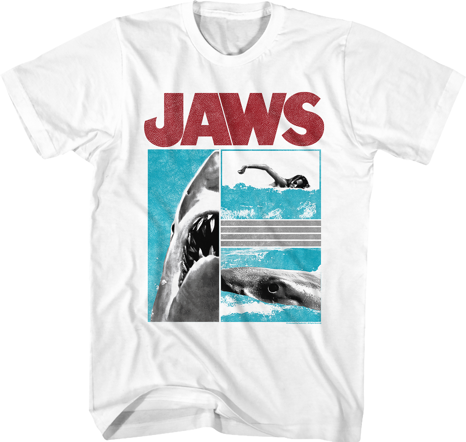 This Jaws t-shirt features panels that show a hungry great white shark ready to attack a swimmer.