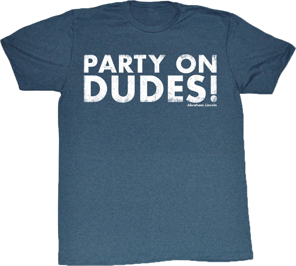 Bill and Ted meet Abraham Lincoln, and as usual put their own spin on the decade causing Lincoln to say the quote that appears on this t-shirt, Party On Dudes!