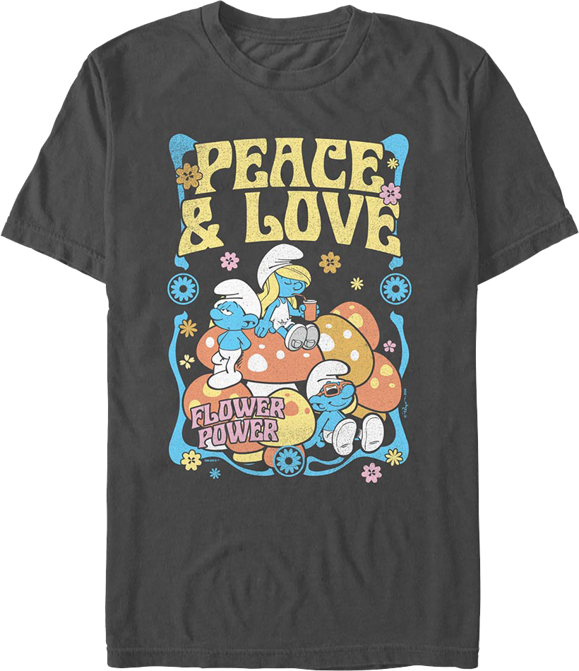 This Smurfs t-shirt shows Smurfs relaxing on mushrooms and surrounded by flowers. The shirt reads "Peace & Love" and "Flower Power".
